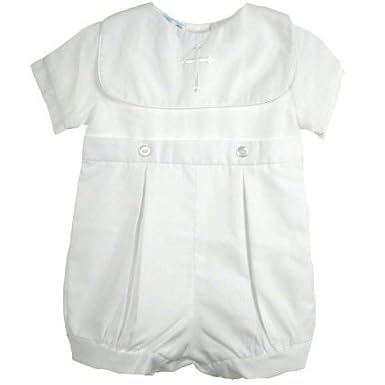 This handsome white short sleeve batiste romper set has bib front with an embroidered cross, buttons at waist, pleats on front and back, three button closure in the back and snaps between the legs. Includes matching bonnet. 65% polyester, 35% cotton.